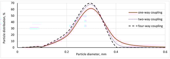 Particle size distributions with one-way, two-way, and four-way coupling models (CFD–DEM).