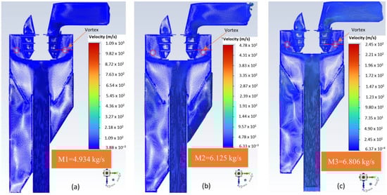 Vortices of airflow into the investigated classifier: (a) M1 = 4.934 kg/s, (b) M2 = 6.125 kg/s, and (c) M3 = 6.806 kg/s.