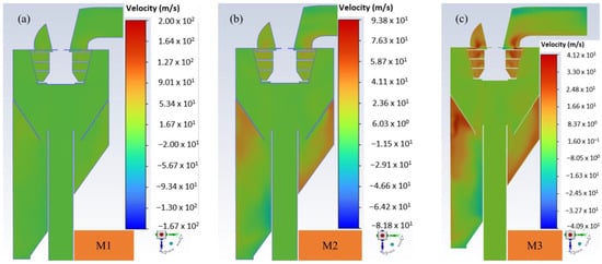 Two-dimensional vector graphs of the flow field are presented in Figure 8. A large vortex forms near the lower section of the rotor cage, obstructing the airflow entry and decreasing the effective classification height. A comparison of the vortices under different conditions shows that the position of the vortex formed under M2 (6.125 kg/s) is the lowest, facilitating airflow entry into the rotor cage and allowing more particles to enter during the classification. Thus, it is inferred that M2 is the best condition. Additionally, large vortices exist in the guide cone region, but their intensities, positions, and rotation directions differ under various outlet mass airflow rates. For M2 = 6.125 kg/s, the airflow mostly moves downward from the guide cone to the coarse material cone, aiding in transporting large particles to the coarse material cone before discharge. A small part of the airflow moves upward from the coarse material cone to the guide cone near the wall, offering a good opportunity to re-clean fine particles from the coarse product. Under outlet mass airflow rates of 4.934 kg/s and 6.806 kg/s, vortices in the coarse material cone return flow to the guide cone, helping fine particles to be re-cleaned from coarse particles. These vortices assist in raising the fine particles again. It is notable that in all three simulation cases, the coarse material cone acts as an air cyclone, functioning like a secondary air separator. The influence of the outlet mass airflow rates on the flow field is further elucidated by analyzing the velocity field distribution as follows.