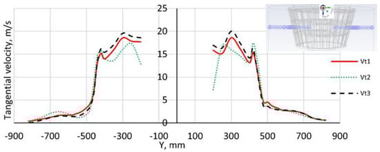 A comparison of air tangential velocities (Vt) at Z = 310 mm. Vt1, Vt2, and Vt3 correspond to M1, M2, and M3, respectively.