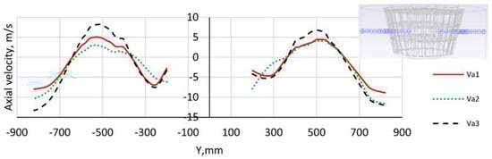 A comparison of air axial velocities (Va) at Z = 310 mm. Va1, Va2, and Va3 correspond to M1, M2, and M3, respectively.