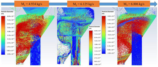 Solid flow patterns under different outlet mass airflow rates. Snapshots were captured at t = 3 s, with the particles colored based on their diameter.