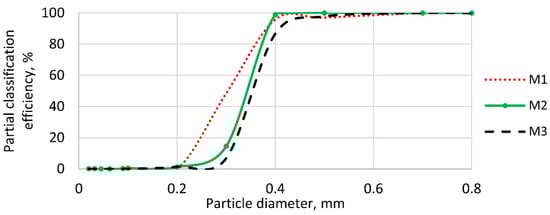 Numerical simulations provide data on the escaped and trapped particles. The efficiency curve is constructed based on the percentage of trapped particles within the total mass of the feed particles of the same size, determining the degree of separation corresponding to varying outlet mass airflow rates. The results are shown in Figure 14.