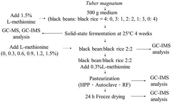 This study, aimed at the preparation of black bean soy sauce, primarily used black beans and black rice as raw materials. Therefore, black beans and black rice were chosen as media for the solid-state fermentation of white truffle, with different black beans and black rice ratios prepared as follows: (A) 4:0, (B) 3:1, (C) 2:2, (D) 1:3, and (E) 0:4. The moisture content was controlled at 40%, and 500 g of the media was placed in a PP bag. They were sterilized in an autoclave at 121 °C for 1 h, then cooled and inoculated with 10 mL of pre-activated culture broth. The samples were incubated at 25 °C for four weeks.