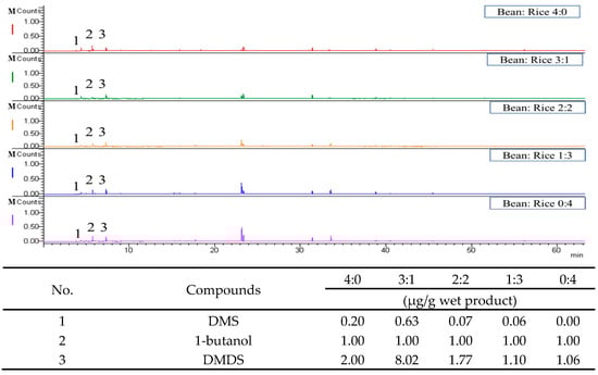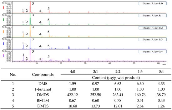 When the ratio of black beans to black rice was 4:0, the DMDS content was the highest, reaching 422.12 μg/g wet weight, but the DMS content was relatively low, resulting in a simpler composition. As the proportion of black rice increased, the DMS content also increased. However, when the ratio of black beans to black rice was 1:3, the DMDS content significantly decreased, and there was a general downward trend in the overall sulfur compound content. Additionally, the characteristic aroma of white truffle, BMTM, was higher in the methionine-added group compared to the group without methionine, as shown in