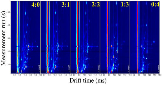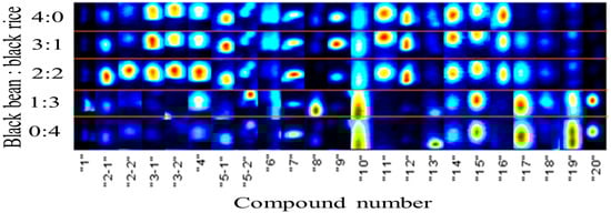 Figure 5. A 2:2 ratio of black beans to black rice had the richest aroma content. The fingerprint profiles of the 4:0 and 3:1 ratios of black beans to black rice were very similar, with the main aroma components being numbered 3-1 to 16. However, the fingerprint profiles of the 1:3 and 0:4 ratios of black beans to black rice were more similar, with characteristic aromas numbered 8, 10, 17, 19, and 20. Compared to the groups with higher black bean content, these groups had fewer and different aroma components.