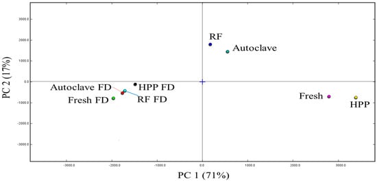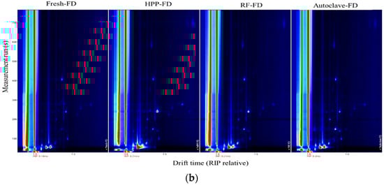 Figure 13b), it was found that the aroma fingerprints representing fresh samples almost disappeared after drying, with only compounds numbered 15 and 18 remaining. Therefore, whether thermal or non-thermal sterilizations were applied, traditional freeze-drying for 24 h resulted in a significant loss of aroma compounds.