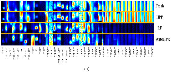 Figure 13). Each number represents a compound, and if a number includes a “-” symbol, it indicates that the compound was detected at the same GC time but different drift times. To understand the changes in aroma after sterilization, the aroma of fresh samples was used as the baseline, and the selected points were applied to each treatment group for comparison. It was more evident that the aroma after HPP sterilization was almost identical to the fresh, non-sterilized samples, while the aromas of radio frequency and autoclave sterilization were more similar to each other. This indicates that heating causes changes in the aroma. Since HPP is a non-thermal process, it does not generate a large amount of heat during sterilization, causing minimal damage to the aroma, thereby maintaining the original aroma of the solid-state fermentation products. Both radio frequency and autoclave sterilization are thermal processes that lead to Maillard reactions during heating, resulting in significant changes in aroma components. Compounds numbered 22–35 disappeared due to the heat during thermal sterilization.