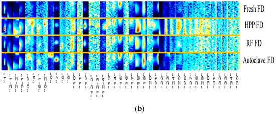 Figure 12a,b illustrate the impact of different sterilization methods and then freeze drying on the aroma of white truffle solid-state fermentation products. Overall, it was found that the HPP sterilization fingerprint profile was closer to that of fresh products, while the aroma profiles of autoclave and radiofrequency sterilization were more similar to each other.