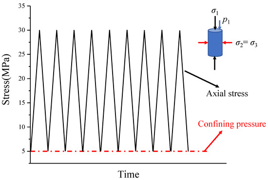 (3) The outlet valve is opened after adsorption equilibrium. When we advance the working face, the abutment stress will change with the working face. The change in abutment stress caused by mining will make the abutment stress of coal seams in front of the working panel increase gradually. With the roadway support and stress redistribution, the abutment stress of coal seams in front of the working panel gradually decreases and returns to almost the same state as before advancing the working face. Therefore, as the working panel continuously advances, the coal seams far away from the working panel will be subject to repeated loading–unloading stresses. Based on the above engineering background, the axial stress is circularly loaded and unloaded when the gas flow of CH4 is unchanged. The loading amplitude is 25 MPa, and the number of cycles is 20. The specific loading path is presented in Figure 3, and the flow chart for experimentation and analysis is shown in Figure 4.