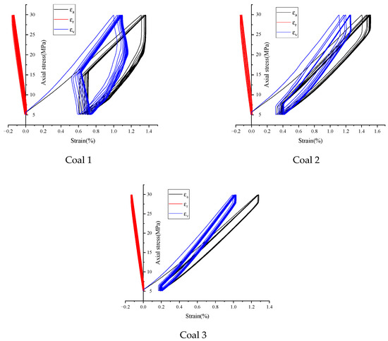 The stress–strain curve for coal specimens with cyclic loading is shown in Figure 5. From Figure 5, we can see that with the cyclic loading of the axial stress, the axial strain, radial strain and volumetric strain increase gradually. This indicates that the irreversible plastic deformation of coal specimens occurs during cyclic loading. Meanwhile, with the repeated loading of the axial stress, some plastic hysteresis loops are formed in the stress–strain curve. The area of the plastic hysteresis loop for the first cycle is the largest, while the area of the plastic hysteresis loop for the subsequent cycles is smaller than that of the first cycle, and the area of the plastic hysteresis loop for the subsequent cycles is almost the same.