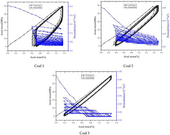 Axial stress–strain curves and permeability–strain curves for coal specimens are shown in Figure 6. When the axial stress is loaded and unloaded cyclically, the axial strain first increases and then decreases, and the permeability first decreases and then increases. In the early stage of cyclic loading, the strain and permeability fluctuate greatly, especially in the first cycle. As the number of cycles increases, the strain continuously increases, permeability continuously decreases, the sensitivity of permeability on axial stress weakens gradually. When the water content increases, the initial permeability gradually decreases. It is shown that the presence of water has obvious inhibition for gas flow. The main reason is that free water blocks the flow channel of gas.