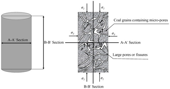 In Figure 7, σ1 is the axial stress, σ3 is the confining stress, σ′ is the abutment stress inside coal specimens, that is, the effective stress for coal specimens, F is the swelling stress resulting from temperature and adsorption, and p is gas pressure. In Figure 7, we first select the section A-A′ to be the research target; it is assumed that the area of the section A-A′ is S. From the principle of stress balance, we can obtain the following formula [30]: