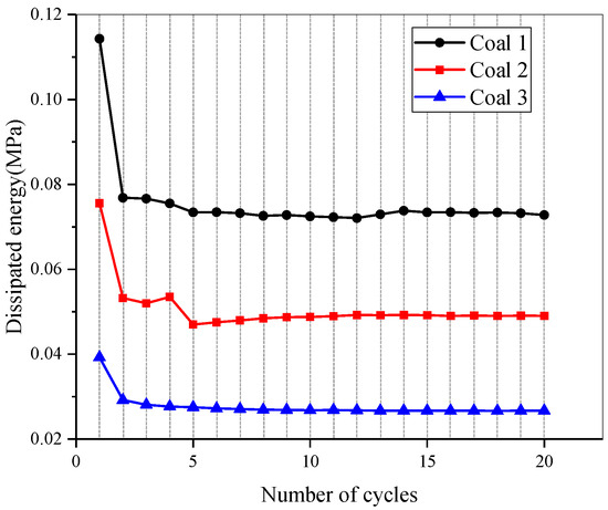 In Figure 8, the dissipation energy of first cycle for three coal samples is the largest. When the cycle number increases, the dissipation energy generally shows a decreasing trend. And the dissipation energy trend stationary is when the cycle is nearing the end. With the increase in water content, the dissipation energy decreases gradually. Water has an obvious inhibition effect for dissipated energy of gas-bearing coal in the process of cycle loading. It is mainly caused by two reasons. First, the pore-water pressure in coal specimens increases gradually, due to the compression effect on fractures, and the pore-water pressure resists the compression effect of axial stress. Second, not only does the coal matrix absorb elastic strain energy, but the pore-water also absorbs a lot of elastic strain energy when the axial stress is loading. The joint action of these two causes leads to the inhibition effect of water on the dissipated energy.