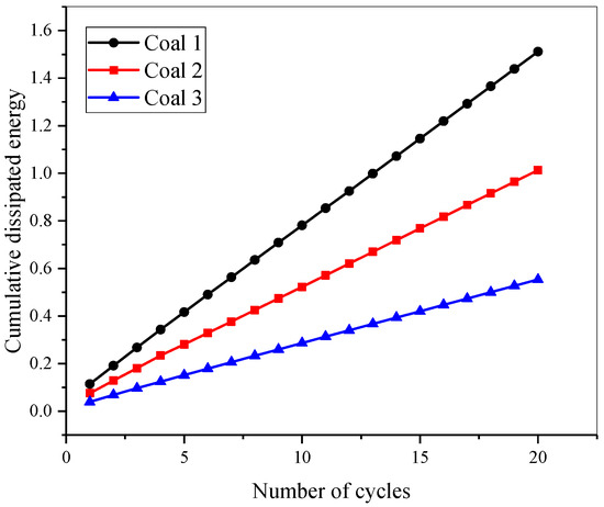 As can be seen from Figure 9, when the cycle number increases gradually, the cumulative dissipation energy generally shows a linear increase, indicating that the damage degree for coal samples increases gradually. When the water content increases, the initial dissipation energy is reduced, and the increased rate of cumulative dissipation energy is reduced. From the above phenomenon, we can see that the dissipation energy can effectively characterize the damage degree of coal samples.