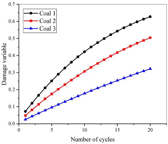 The damage variables of three coal samples under cyclic loading will be obtained by Equation (12), as shown in Figure 10.