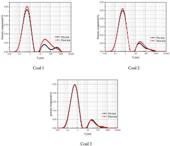 Figure 11 reveals the T2 distribution for coal specimens before and after the experiments. The T2 distributions for three coal specimens exist as three peaks, characterizing the micropore (first peak), mesopore (second peak) and macropore (third peak) inside coal specimens, respectively. Although often the second- and third-peak curves are connected and not easily distinguishable, it does not affect the analysis of the evolution laws of the second and third peaks. It can be easily concluded that coal specimens are mainly composed of micropores, while the proportion of mesopores and macropores is small.