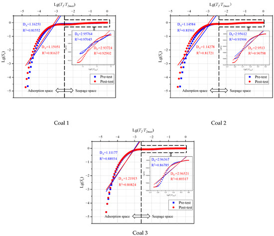 The relationship between log(Sv) and log(T2/T2max) of the coal specimens before and after the experiments is shown in Figure 12. We can obtain the fractal dimension of adsorption pores and seepage pores by using Equation (16). The values of fractal dimension for coal specimens before and after cyclic loading are calculated by using the slope of the curves in Figure 12, namely, the values of DA, DA′, DS and DS′.