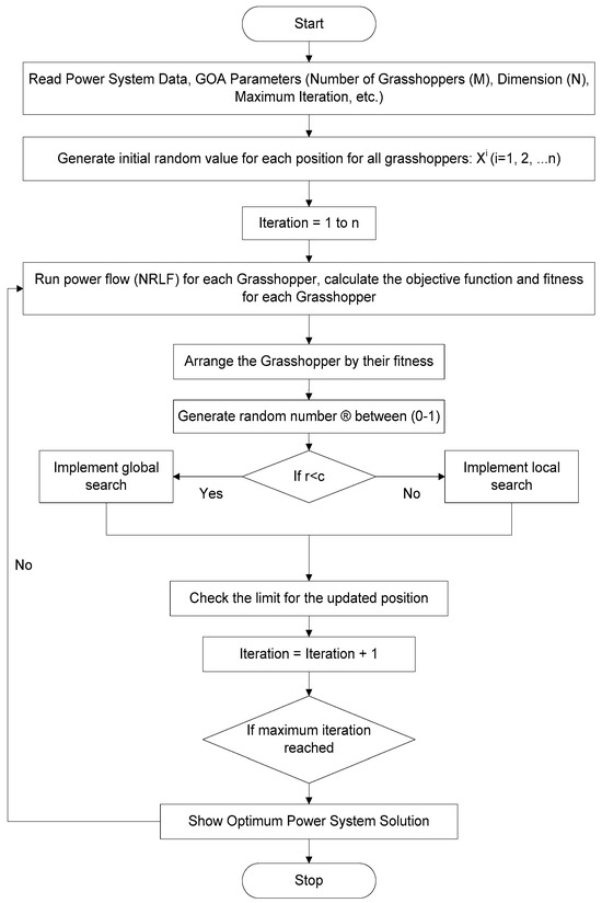 Here, ‘N’ is the number of grasshoppers in the population. The best solution found by the swarm is treated as an objective that the grasshopper population continually improves. The flow chart of the GOA is given in Figure 1. The GOA contributes to solving the ORPD problem by efficiently exploring the solution space and optimizing both reactive power dispatch and demand response programs. It provides superior solutions to other algorithms in terms of minimizing voltage deviations and operational costs. GOA offers benefits such as an improved convergence speed, better exploration and exploitation balance, and the ability to handle multi-objective problems like minimizing both costs and voltage deviations simultaneously.