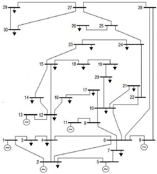 - The University of Washington Electrical Engineering. Power System Test Case Archive, the IEEE 30-Bus Test System Data. Available online: https://www2.ee.washington.edu/research/pstca/formats/cdf.txt (accessed on 19 April 2021).
