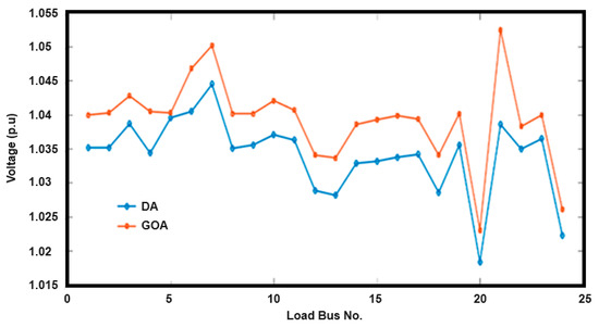 The primary objective behind tackling the Optimal Reactive Power Dispatch (ORPD) problem is fundamentally centered on the imperative goal of decreasing the total voltage deviation (TVD), which is recognized as a critical factor that significantly influences the stability and reliability of power systems. By optimizing the reactive power dispatch, one can effectively maintain the voltage levels within designated safe limits, thereby enhancing the overall performance and operational efficiency of the entire system. Figure 4 illustrates the load voltages of the IEEE 30 bus system when utilizing both the GOA and the DA. Moreover, the visual representations in Figure 4 meticulously verify the conformity of these load voltages to the predefined violation limits, thereby ensuring that they remain compliant throughout the entire optimization process that is aimed at minimizing the total voltage deviation.