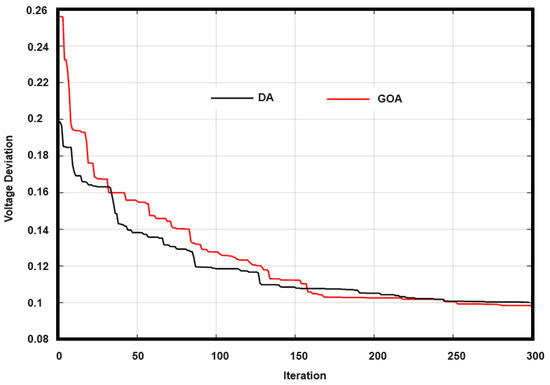 From the insights in Table 1, it becomes clear that the GOA demonstrates superior performance by successfully reducing the total voltage deviation (TVD) to a significant value of 0.984 per unit (p.u.), which constitutes a significant decrease of 90.701% when compared to the initial value of 1.0582 p.u. This performance distinctly outperforms the DA, which, while commendable, achieves a total voltage deviation of 0.09990 p.u., thereby marking a slightly lesser reduction of 90.5594%. These results serve to highlight the efficiency of the GOA in adeptly addressing and mitigating voltage deviation issues that are commonly encountered in contemporary power systems. Figure 3 provides a visual representation of the total voltage deviation (TVD) for all load voltages within the IEEE-30 bus system, showcasing the performance of various optimization algorithms used in this analysis. From the information presented in Figure 3, it can be conclusively verified that the GOA consistently yields better results in comparison to the other algorithms that have been implemented within this study.