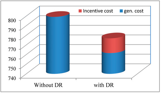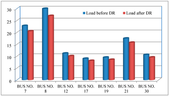 By optimizing the generation schedules, the demand response strategies play a crucial role in helping to mitigate voltage deviations while simultaneously enhancing the stability of the overall system. The numerical results that detail the load reduction achieved in the context of responsive loads are presented in Table 2, while Figure 6 visually illustrates the extent of load reduction observed at the response buses. The data indicate that incentive-based demand response strategies can effectively shift the electrical load away from peak periods, thus contributing to a significant reduction in the overall system demand during critical times that require careful management. This strategic load shifting not only aids in the maintenance of voltage stability but also serves to diminish the necessity for costly peak generation resources that can strain the system during high-demand periods. Figure 6 is an exemplary representation that captures a key notion regarding the significant effects produced by the aforementioned method under examination. The computations for the cost functions were carefully constructed and assessed in compliance with the criteria specified in Equation (9). The deployment of the demand response (incentive-based) tactics has resulted in a significant and noticeable decrease in the value of the cost function.