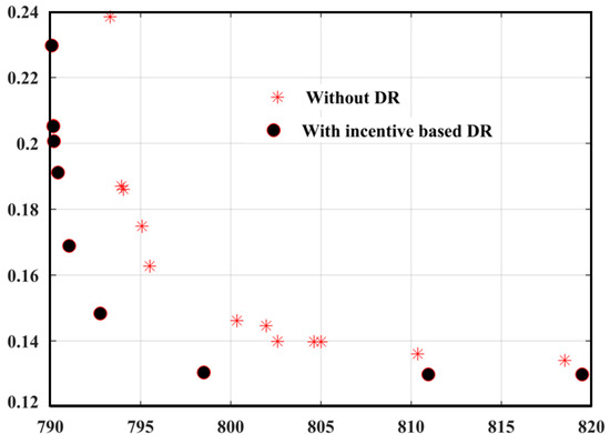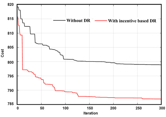 Figure 8 provides a comprehensive illustration of the pronounced differences in cost function values between the scenarios in which the demand response integration is present and those where it is absent. Notably, the introduction of incentive mechanisms reveals a clear and significant reduction in total costs when compared to situations lacking any demand response strategies, serving to emphasize the substantial economic advantages that can be realized through the encouragement of consumer participation in demand response programs. By motivating consumers to either decrease or shift their energy consumption during peak demand periods through the provision of financial incentives, the total electricity costs can be effectively reduced. This decrease in costs is primarily facilitated by lessening the necessity for expensive peaking power plants and alleviating the pressure placed on the electrical grid. The economic advantages associated with incentive-based demand response programs are considerable as they provide a viable and cost-efficient approach to harmonizing supply with demand while simultaneously ensuring the stability and reliability of the grid system.