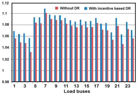 Load bus voltage profile with and without DR program.
