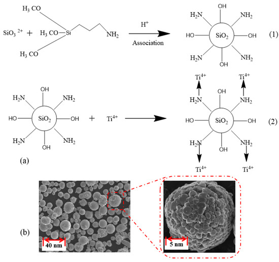 First, 3.5 g of γ-aminopropyltrimethoxysilane and 45 g of sodium silicate solution (35%) were poured into a three-necked flask containing 40 mL of deionized water and 50 mL of ethanol. Simultaneously, hydrochloric acid was then added dropwise to the flask to adjust the pH to 9. The solid particles were washed after reacting at 60 °C for 3 h. Immediately, 20 mL of xylene, 15 g of surface-modified nano-silica and 5 g of titanium tetrachloride were added into a 250 mL three-necked flask and reacted for 5 h at 100 °C. The prepared nano titanium cross-linker is a white granular solid with a few protrusions on the surface, and the synthesis process (Figure 2a) and chemical characterization (Figure 2b) are shown in Figure 2.