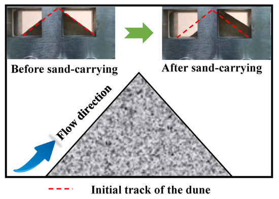 The pre-pressurized water-based fracturing fluid is injected at a constant flow rate from one side of the sand-carrying device. If the shear rate is to be evaluated, the injection flow rate needs to be changed to maintain a constant temperature and pressure. First, the positive area of the sand pile before carrying the sand is measured. After the fracturing fluid carries the sand for 5 min, the experiment is stopped, and the area change value of the back of the sand pile is measured (Figure 3). The calculation of the sand-carrying performance of water-based fracturing fluid is shown in Equation (2).