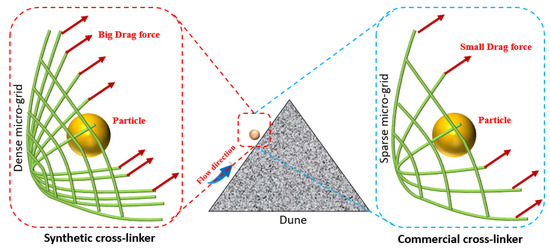 The theory presented in Equations (1)–(3) clearly demonstrates that the drag force Fd exerted by water-based fracturing fluids on particles is directly proportional to the viscosity of the fluid. Simultaneously, the increase in viscosity of the fracturing fluid facilitates the drag of particles by the fluid, which enables the particles to ascend the sand dune and subsequently reach the opposite side. However, the drag force of water-based fracturing fluid on particles is closely related to the formation, quantity, and bond energy of chemical bonds at a microscopic level (Figure 5). Chemical kinetics suggests that the numerous hydroxyl groups around the nano-titanium cross-linker can interact with the hydroxyl groups in guar gum molecules to form hydrogen bonds [37]. These bonds facilitate the connection between guar gum molecules and the cross-linker, acting as a medium. The microscopic grid formed by hydrogen bonds between molecules of the fracturing fluid can carry particles forward. A smaller content of cross-linker results in an insufficient number of hydrogen bonds and micro-grid density, which, in turn, impedes the migration of particles over long distances with the fracturing fluid. However, a high content of cross-linker facilitates the formation of additional hydrogen bonds with an increased number of guar molecules, thereby contributing to an enhancement in micro-grid density. The grid constructed by chemical bonds between molecules is like a huge fishing net that can drag particles forward. Thus, the cross-linker content affects the viscosity of the fracturing fluid on a macroscopic level to facilitate particle carrying, while on a microscopic level, it primarily increases the drag force of the fracturing fluid on the particles by forming a microscopic grid. Nevertheless, the limited number of hydroxyl groups present in commercially available cross-linker molecules is insufficient to form additional hydrogen bonds with guanidine gum molecules, which markedly reduces the micro-grid density. This reduction in micro-grid density may result in a decrease in macroscopic viscosity and sand-carrying capacity.