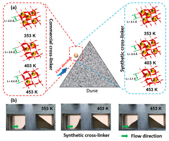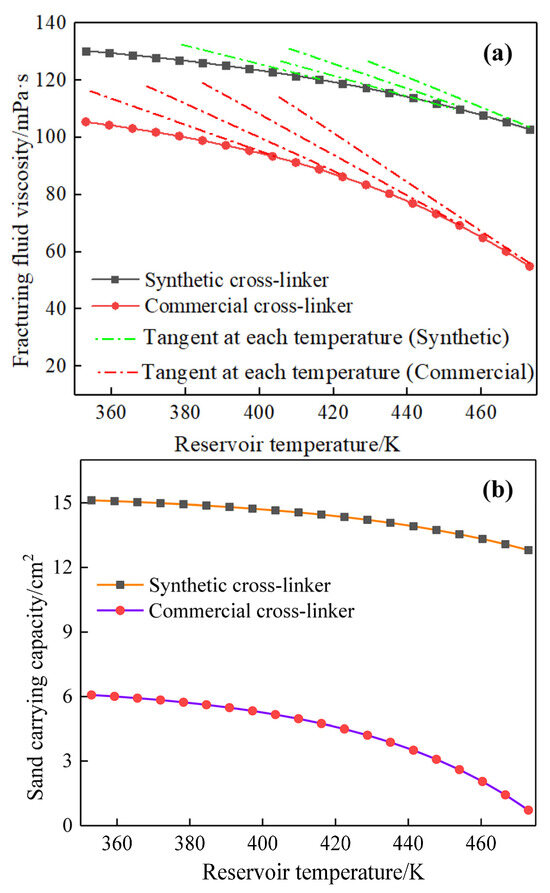 The non-Newtonian fluid characteristics of water-based fracturing fluids [38,39] indicated that reservoir temperature impacts their rheological properties and sand-carrying capacity, and Figure 6 demonstrates the impact of reservoir temperature on fracturing fluid viscosity and sand-carrying capacity. We can conclude from Figure 6 that a very significant reduction in the viscosity of water-based fracturing fluids is demonstrated with an increase in the reservoir temperature, and the effect of reservoir temperature on fracturing fluid viscosity shows a completely different trend from that of cross-linker content. The aforementioned phenomenon indicates that the continuously increasing reservoir temperature is detrimental to the viscosity stability of water-based fracturing fluids, significantly impacting fracture expansion and the improvement of the oil recovery. In addition, a low reservoir temperature can maintain a high viscosity of the fracturing fluid, with a relatively slow decrease in viscosity. Conversely, a high temperature will cause a more rapid decrease in the fluid viscosity than a low temperature. Figure 6, additionally, illustrates that the synthesized cross-linker exhibits enhanced temperature resistance for water-based fracturing fluids in comparison to commercially available cross-linkers. Therefore, 0.3% of commercially available cross-linking agent can make the viscosity of fracturing fluid reach 105 mPa·s at 353 K, while the reservoir temperature of 453 K makes the viscosity of fracturing fluid drop rapidly to 70 mPa·s. Meanwhile, 0.3% of synthetic cross-linker only reduces the viscosity of water-based fracturing fluid from 130 mPa·s at 353 K to 110 mPa·s at 453 K. The smaller viscosity reduction value of the synthetic cross-linker demonstrates its superior temperature resistance to water-based fracturing fluids than commercial cross-linkers.