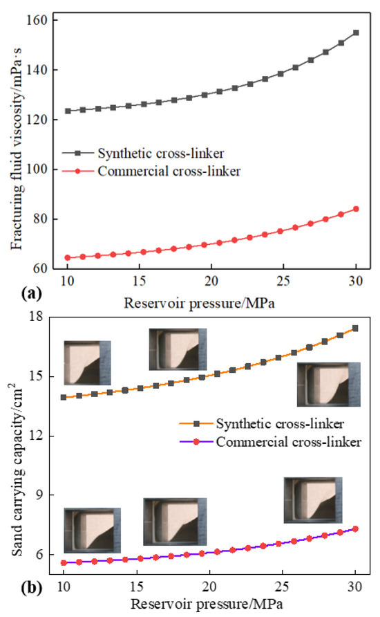 In addition, Figure 7a,b also show the performance change trend of water-based fracturing fluid containing 0.3% commercial cross-linker under the same reservoir pressure. Water-based fracturing fluids containing commercially available cross-linking agents not only gradually increase in viscosity as reservoir pressure rises but also exhibit a significant direct proportional relationship between sand-carrying capacity and reservoir pressure. Similarly, low reservoir pressure also causes a relatively weak fluid viscosity and sand-carrying capacity of water-based fracturing fluids containing commercial cross-linkers, and the above two parameters can be expressed as 65 mPa·s and 5.6 cm2, respectively, in a reservoir environment of 10 MPa. However, reservoir pressure of 25 MPa will increase fluid viscosity and sand-carrying capacity to 77 mPa·s and 6.6 cm2. Although the fracturing fluid containing a commercial cross-linker will continue to improve with the increase in reservoir pressure, the increase is still lower than that of the synthetic cross-linker. Low reservoir pressure will cause the distances between water, guar gum, and cross-linkers in water-based fracturing fluid to be relatively large, which is not conducive to the formation of a substantial number of hydrogen bonds and microscopic grids [45]. Smaller micro-grid density at low pressure leads to a weaker fluid viscosity and sand-carrying capacity of water-based fracturing fluid. However, the molecules that were previously unable to form chemical bonds due to the substantial molecular distance gradually interact with each other as a consequence of the augmented reservoir pressure, and more intermolecular hydrogen bonds and a greater micro-grid density were shown with the increasing reservoir pressure [46]. Furthermore, the synthetic cross-linker molecules contain more hydroxyl and functional groups, enabling the formation of more intermolecular hydrogen bonds under the same cross-linker content and reservoir pressure. Additionally, high reservoir pressure will cause the synthetic cross-linker to form more hydrogen bonds, resulting in significant changes in many properties of the fracturing fluid [47]. Increasing reservoir pressure will not cause commercial cross-linker molecules to quickly form a large number of hydrogen bonds with water and guar gum, thereby reducing the impact of reservoir pressure on the performance of fracturing fluids containing commercial cross-linkers.