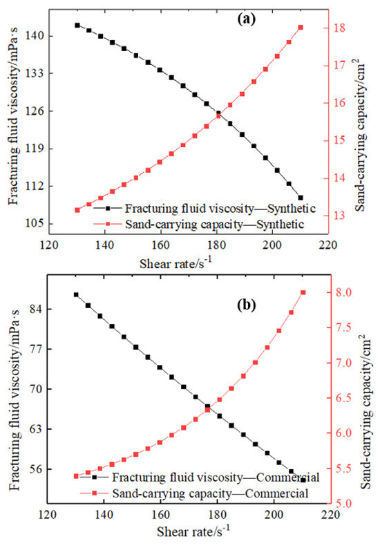 The shear rate of water-based fracturing fluid is not only regarded as a significant factor changing the self-parameters of water-based fracturing fluid (fluid viscosity), but also affects the carrying capacity of fracturing fluid on proppant particles. It can be illustrated from Figure 9a,b that a gradually decreasing fluid viscosity is demonstrated with increasing the shear rate of water-based fracturing fluid, and the sand-carrying capacity of fracturing fluid is gradually increasing when an increasing fluid velocity is displayed. The obvious inverse relationship between the viscosity and shear rate of the fracturing fluid also indicates that water-based fracturing fluid has a very unique shear thinning property, and the fracturing fluids containing cross-linkers are also considered as a non-Newtonian fluid. The low shear rates will result in a relatively minor reduction in the viscosity of water-based fracturing fluids. The viscosity of the fracturing fluid containing 0.3% synthetic cross-linker was observed to decrease from 142 mPa·s at 130 s−1 to 137 mPa·s at 150 s−1. The viscosity reduction value of 5 mPa·s indicates that low shear rates have an extremely weak shear capacity on water-based fracturing fluids. Nevertheless, an increase in the viscosity of the fracturing fluid to 170 s−1 will result in a relatively rapid decrease in fluid viscosity.