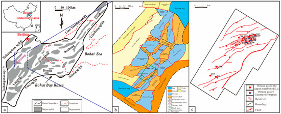 Regional geological map and study area map of the Liuchu area in Raoyang Sag, Jizhong Depression [24]. (a) The situation of Raoyang Sag, China; (b) the situation of Liuchu area in Bohai Bay Basin; (c) the situation of the study area.