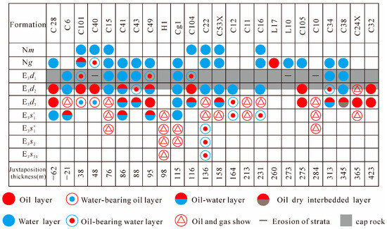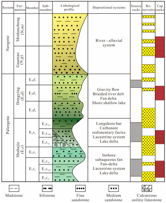 The Liuchu area is located in the south-central part of the Raoyang Sag in the Jizhong Depression of the Bohai Bay Basin, China (Figure 1a), which is an asymmetric inherited anticline structure formed by the bi-directional compression at the eastern and western boundary faults [17,18]. It is an important area that has not been studied yet. It extends northeast for about 22 km and has a width of approximately 15 km, covering a total area of around 242 km2. The strata developed in this area from the bottom to the top are mainly Palaeogene (Kongdian Formation (E2k), Shahejie Formation (E3s), and Dongying Formation (E3d)), Neogene (Guantao Formation (N1g) and Minghuazhen Formation (N2m)), and a small amount of Quaternary (Q) [19]. Most hydrocarbons are discovered in the Dongying Formation, with a limited distribution in the Shahejie Formation, Guantao Formation, and Minghuazhen Formation. Hydrocarbons are mainly supplied from the underlying E3s1 source rock [18,20,21]. The source–reservoir–cap assemblage is classified as the lower source and upper reservoir type [22]. The E3s1 layer primarily consists of braided rivers, with mainly conglomerate and sandstone lithology. Occasionally, there are red mudstones at the bottom, indicating an oxidizing environment. The middle section comprises deep lake sedimentary rocks, predominantly mudstone with a general gray color and occasional thin limestone layers. The upper part shows delta deposition, characterized by mainly sandstone lithology with a thin layer of mudstone, and a gray color. The middle and lower parts of the Dongying Formation are shallow lake sediments, mainly mudstone. The bottom is dark red, the middle is gray siltstone, and the upper part is braided river deposition, which is composed of sandstone and mudstone interbeds (Figure 2) [23]. Figure 1c shows that the oil and gas discovered in the E3d2U Formation in the Liuchu area are primarily located in the north, with a small amount in the west-central part of the area, which is due to the effect of the E3d1-2 regional mudstone cap rocks on the diversion of oil and gas transported along the oil source faults. It is crucial to predict how the regional mudstone cap rocks affect the diversion of hydrocarbon migration through the oil source faults in the Liuchu area.