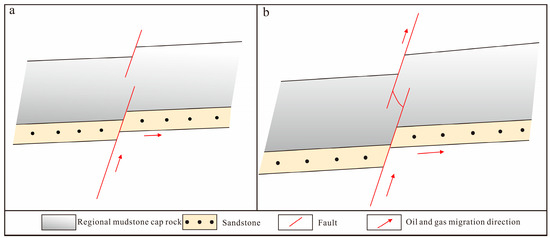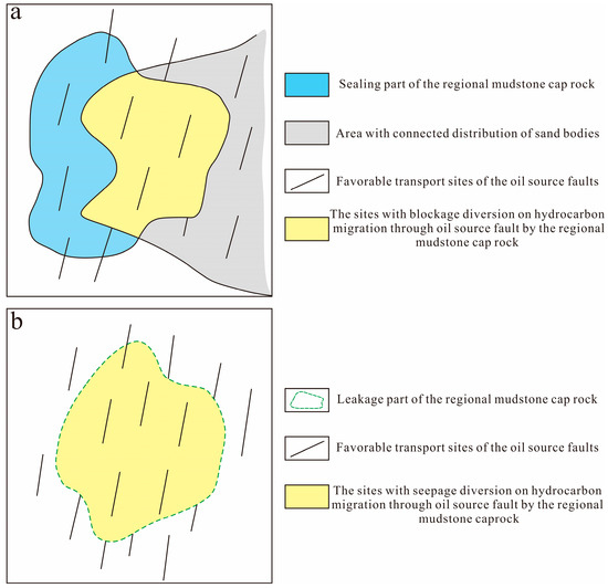 Schematic drawing illustrating the hydrocarbon migration sites of the oil source fault affected by the regional mudstone cap rock: (a) blockage diversion site; (b) seepage diversion site.