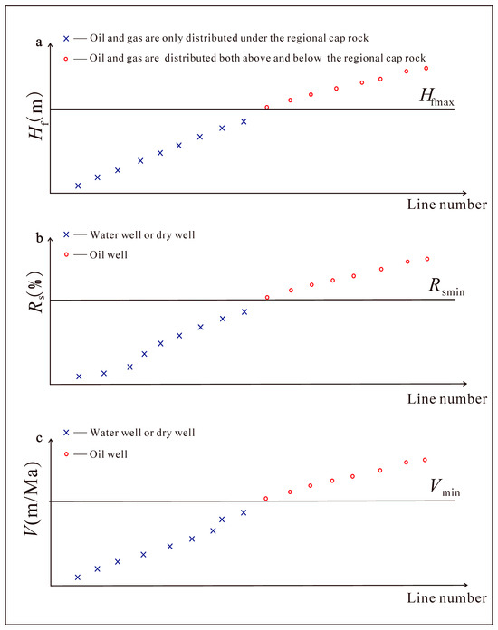 Schematic diagram defining the lower cutoff values of the parameters used to predict the oil source fault’s different hydrocarbon diversion migration sites controlled by the regional mudstone cap rock: (a) maximum juxtaposition thickness required for the fault to grow up and down in the regional mudstone cap rock; (b) maximum stratigraphic sand ratio required for the sand bodies to connect; (c) minimum activity rate required to transport hydrocarbons on a fault.