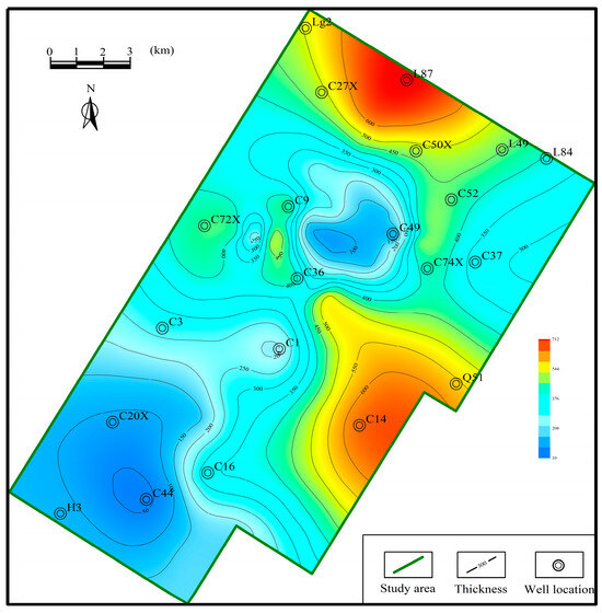 Based on the drilling data, we obtained the distribution of the regional mudstone cap rocks of the E3d1-2 Formations in the Liuchu area. Figure 6 shows that the maximum thickness of the E3d1-2 regional mudstone cap rocks in the Liuchu area is over 550 m, mostly distributed in the southeast and north. The thickness gradually decreases from the two high-value areas to the surrounding area (i.e., 50 m in the southwest). The seismic data illustrate that many fault types exist in the regional E3d1-2 mudstone cap rocks in the Liuchu area. The faults originating from the E3s1 source rocks connect with the E3d1-2 formations and are active during the middle and late stages of deposition of the N2m. This is the period when hydrocarbons in the region start to accumulate. The drilling and seismic data were utilized to estimate the predominance of oil source faults in the northern part of the Liuchu area, with secondary development in the south-central area, as depicted in Figure 1. At the same time, using the data provided, we employed the maximum fault distance subtraction method to determine the paleo fault throw of oil source faults from the middle to the late stage of N2m deposition. Additionally, we utilized the ancient stratigraphic thickness recovery method to restore the paleo thickness of the mudstone cap rocks during the hydrocarbon accumulation period [38,39,40]. By subtracting the two, we obtained the ancient break thickness of the E3d1-2 cap rock. The maximum juxtaposition thickness of the segments of the oil source fault in the Liuchu area needed to connect both upward and downward within the E3d1-2 regional mudstone cap rock is about 275 m (see Figure 7). This information allows us to determine the blockage and seepage area of the cap rock in the Liuchu area. As shown in Figure 8, the seepage area of the E3d1-2 regional mudstone cap rocks in the Liuchu area is pervasively distributed in the northeastern and western parts. The rest of the area is the blockage area.