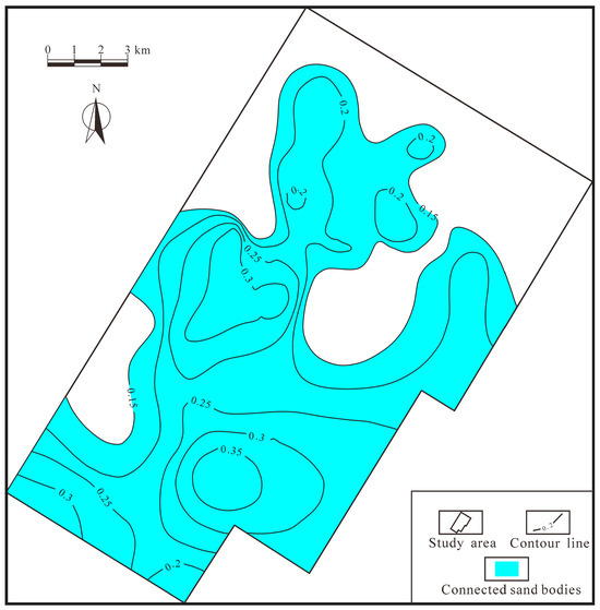 The sand-to-shale ratio of the E3d2U Formation can be obtained from the drilling data. Figure 9 shows that the maximum sand-to-shale ratio of the members in the Liuchu area is over 30%, dominantly in the north-central and southwestern parts. The sand-to-shale ratio of the E3d2U Formation gradually decreases from the three areas of high value to the surrounding areas. The ratio decreases to less than 10% in the northern part. Using the minimum cutoff value of the sand-to-shale ratio, at about 15%, we found that the area with connected distribution of sand bodies of the upper E3d2 member is mainly distributed in the south-central part of the Liuchu area and secondly distributed in the northern part (Figure 10).
