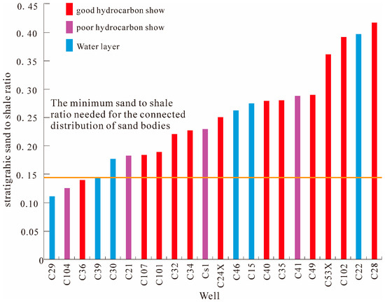 The minimum sand-to-shale ratio needed for the connected distribution of sand bodies in the reservoirs of the study area was determined based on the prediction method described in the literature [35] (Figure 5b). Drilling data are used for the calculation of the sand-to-shale ratio. The area of connected distribution of sand bodies under the regional mudstone cap rock is determined when the derived sand-to-shale ratio is greater than or equal to the minimum stratigraphic sand-to-shale ratio required for the continuous distribution of sand bodies (Figure 4a).