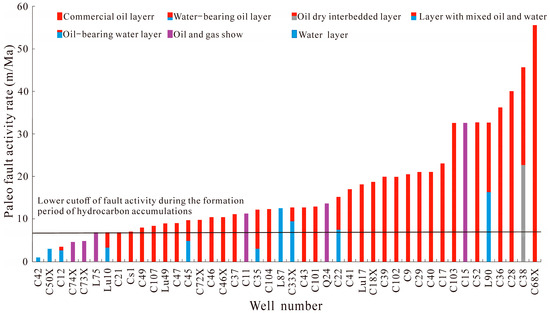 Seismic data are used to measure the current distance of faults in oil sources. We use the maximum fault throw subtraction method [36,37] to recover the paleo fault throw during the hydrocarbon accumulation period. The throw of the ancient fault is divided by the corresponding period to calculate the ancient activity velocity of the oil source fault in the reservoir beneath the regional mudstone cap rock. Furthermore, we identify the minimum activity rate required for hydrocarbon migration in our study area using the method described in the literature [3] (Figure 5c). The oil and gas migration path can be identified by calculating the historical activity rate of the oil source fault under the mudstone cap rock. The minimum activity rate is calculated, and if the historical activity rate is greater than or equal to the minimum activity rate, then the regional mudstone cap rock assists in the upward migration of oil and gas from the oil source fault below.