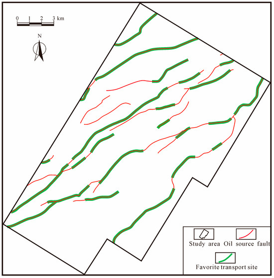 Firstly, the current fault throw of the upper E3d2 member is measured. The method of maximum fault throw subtraction is used to determine the distance of the ancient fault throw during the middle-late stage of the N2m oil and gas accumulation period. Then, the ancient fault throw is divided according to the active fault period, and the activity rate of the ancient fault distance for the oil source fault is calculated. It is estimated that the minimum activity rate required for oil and gas migration of oil source faults in the Liuchu area is about 6.5 m/Ma (Figure 11). Therefore, the distribution of the favorable transport sites of the oil source fault in the E3d2U reservoir under the E3d1-2 regional mudstone cap rock is delineated, as shown in Figure 12. We observed that in the E3d2U oil source fault under the mudstone cap rock in the E3d1-2 area, the favorable location of oil and gas migration is mainly distributed in the north of the Liuchu area, and secondarily in the southwestern part (Figure 12).