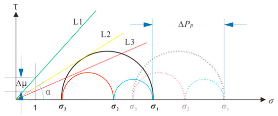 According to the Mohr–Coulomb failure criterion, a Mohr–Coulomb stress circle is established (Figure 2), where , , and are the maximum, intermediate, and minimum effective stresses, respectively. When the shear stress on the fracture zone , that is, L1 is far away from the Mohr–Coulomb circle, it is in a stable state and does not slip. When , that is, L2 is tangent to the Mohr–Coulomb circle, the fracture zone is in a critical state of slip. When , that is, L3 intersects the Mohr–Coulomb stress circle, the fracture zone is in an unstable state and is dislocated along the fault plane.