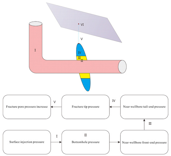 Fluid is continuously injected in the fracturing process. On one hand, a series of hydraulic fractures are generated to connect the wellbore with the natural fracture zone. On the other hand, the continuous fluid injection changes the initial stress state of and around the hydraulic fractures and fracture zones, increasing the probability of fracture zone slip. As shown in Figure 2, during the fluid injection, the pore pressure in the fracture zone rises continuously, and the Mohr–Coulomb stress circle moves from right to left. When the pore pressure rises to a certain value, the fault is in transition from a stable state to a slip critical state. According to the Mohr–Coulomb stress circle, the critical value of the increase in pore pressure during the transition from a stable state to a slip critical state is expressed as follows:
