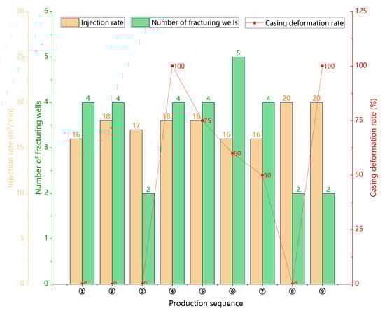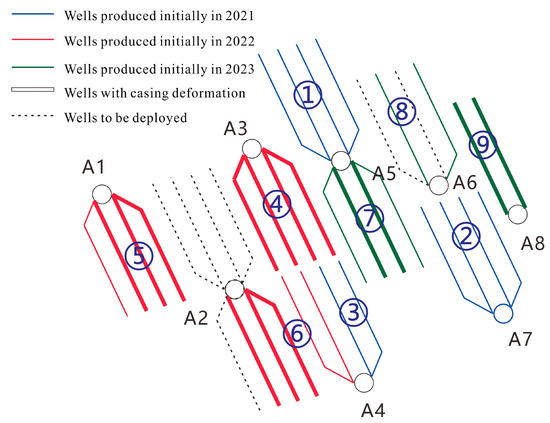 According to the nodal analysis method, the intersection points of stages meet the constraint conditions of equal pressure and equal flow rate. The distribution characteristics of fluid pressure under dynamic fracture propagation during hydraulic fracturing are obtained by solving the above equations simultaneously. The time of communicating with the fracture zone is controlled by the time that the major fracture propagates to the limit length and the pressure transmission time from point to the fracture zone. A smaller injection rate causes a longer time for the hydraulic fracture to . According to Equation (21), the smaller the critical transmission pressure difference , the lower the pressure transmission coefficient of the matrix reservoir, the longer the transmission time from the limit point to the fracture zone, and the smaller the risk of fault activation. As shown in Figure 4, A1–A8 pads were developed in an area of the Luzhou block, and the fracturing and production of a single well were carried out for three years. The wells on the A5-North, A7, and A4-East pads were completed in 2021; the wells on the A3, A1, A2, and A4-West pads were completed in 2022; the wells on the A5-South, A6, and A8 pads were completed in 2023. The bold lines represent wells with casing deformation. Because of pressure depletion around the previously produced wells, the critical transmission pressure difference increased, and the risk of fracture zone slip around the wells increased. Casing deformation occurs in a certain proportion of fracturing wells at later stages, and there is no obvious correlation between casing deformation and the injection rate in this area (Figure 5). This is consistent with our understanding that the injection rate has no significant effect on .