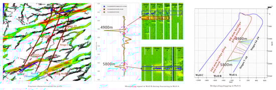 When light waves are transmitted in optical fibers, changes in the vibration, temperature, pressure, strain, and magnetic field cause changes in amplitude, phase, polarization, wavelength, and other optical characteristics. Hydraulic fracture propagation is characterized by monitoring the change in optical characteristics. The optical fiber that monitors vibration is called distributed acoustic fiber sensing (DAS). A fiber that monitors temperature changes is called distributed temperature fiber sensing (DTS), and a fiber that monitors stress–strain is called distributed strain fiber sensing (DSS). Using professional processing and interpretation software to process sound, temperature, and strain to obtain relevant information, such as gas and liquid production profiles, hydraulic fracture propagation, etc. (Wu et al., 2019) [36], wide-area electromagnetic monitoring was used to characterize the swept area of hydraulic fractures by monitoring small changes in reservoir fluid resistivity during hydraulic fracturing. Microseismic monitoring is the most widely used fracture monitoring technology in China, where casing deformation is identified through microseismic monitoring technology.