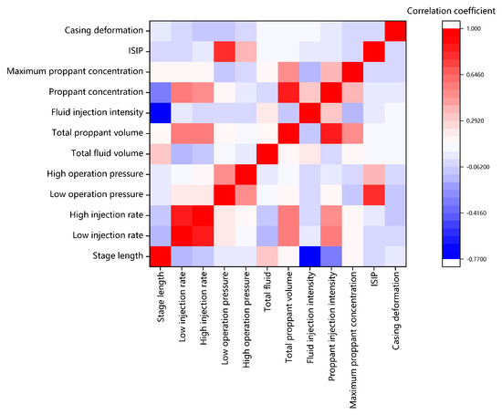 Fracturing parameters are the key elements to achieving a high gas well production. To clarify the direction of optimizing fracturing parameters, we analyzed the main engineering factors regarding casing deformation based on the fracturing parameters of 7428 stages in shale gas wells in southern Sichuan Basin by considering the stage length; injection rate; surface pump pressure; total fluid volume; total proppant volume; fluid injection intensity, which is injected based on volume per meter; proppant injection intensity, which is injected based on proppant weight per meter; maximum proppant concentration; and shut-in pressure. Pearson correlation analysis [39] was first performed, as shown in Figure 8. Casing deformation was significantly correlated to injection rate, surface pump pressure, total fluid volume, total proppant volume, shut-in pressure, fluid injection intensity, and proppant injection intensity. There was a strong co-linearity between the low and high injection rates, between surface pump pressure and shut-in pressure, between proppant injection intensity and total proppant volume, and between proppant injection intensity and fluid injection intensity. Thus, the Pearson correlation analysis showed that the injection rate, surface pump pressure, total fluid volume, and proppant injection intensity were the major engineering factors in casing deformation.