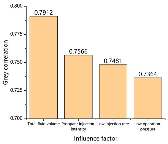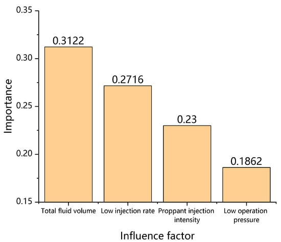 Grey correlation analysis [40] was conducted for 7428 stage sample points and four selected parameters, and the parameters were ranked as follows: total fluid volume > proppant injection intensity > low injection rate > low surface pump pressure, according to the correlation degree (Figure 9). The importance of engineering parameters based on the BP neural network analysis [41] was evaluated with 60% of the training samples and 40% of the test samples. The results showed that the casing deformation engineering factors ranked according to importance were as follows: total fluid volume > low injection rate > proppant injection intensity > low surface pump pressure (Figure 10).